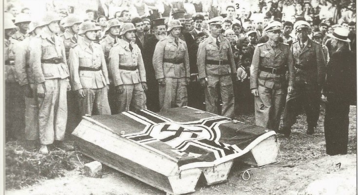 Τρεις Άγγλοι αεροπόροι κηδεύονται μετά την πτώση του αεροπλάνου τους στη θέση «Κεφάλα» Πρώτος δεξιά ο Πρόεδρος της κοινότητας Καστελίου Καργιαντουλάκης Μιχάλης. Τρίτος από δεξιά ο Διοικητής του αεροδρομίου Καστελίου Ταγματάρχης Τρόστ.