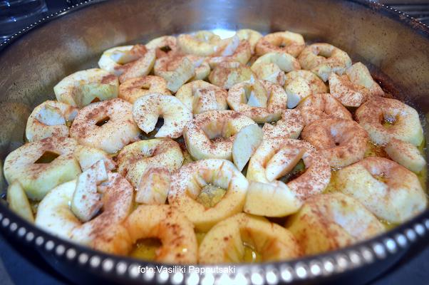 Στη συνέχεια τοποθετούμε (στρώνουμε) τα μήλα πάνω στο λιωμένο βιτάμ .