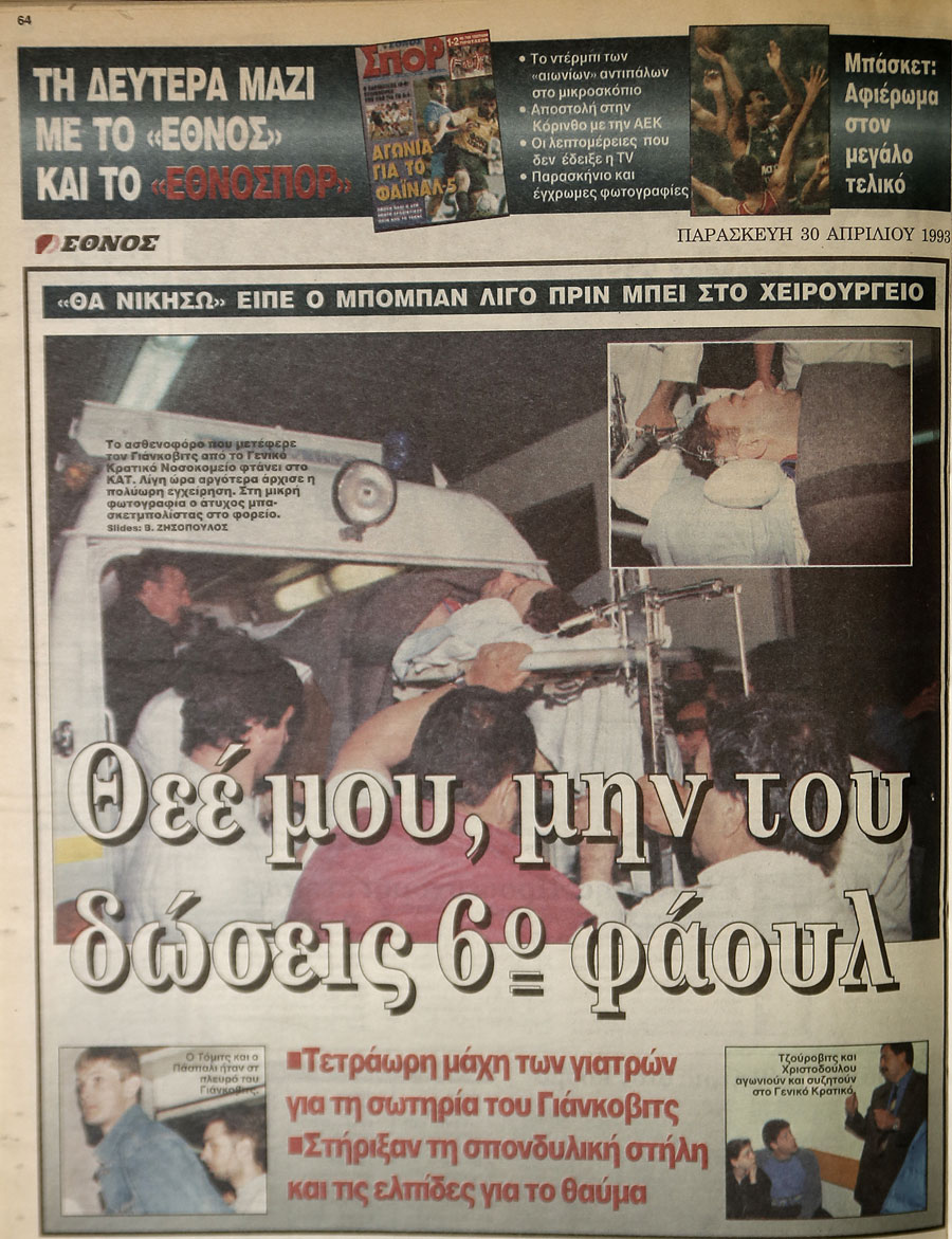 Σ” αυτή την κατάμαυρη μέρα για το ευρωπαϊκό μπάσκετ, πριν από 22 χρόνια ακριβώς (21/4/1993), ο Μπόμπαν Γιάνκοβιτς σόκαρε όσο κανείς άλλος την κοινή γνώμη, μ’εκείνο το απίστευτο τραυματισμό στην μπασκέτα του κλειστού Αρτάκης που τον καθήλωσε στο αναπηρικό καροτσάκι για τα υπόλοιπα 13 χρόνια της ζωής του.