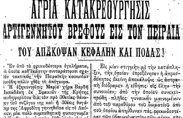 Η φρικαλέα δολοφονία της 4χρονης Άννυ από τον πατέρα της, αλλά και οι λεπτομέρειες που αποκαλύφθηκαν σιγά – σιγά, άφησαν άφωνη όλη την Ελλάδα. Ωστόσο στο παρελθόν έχουν καταγραφεί κι άλλα περιστατικά, με θύματα μικρά παιδιά ή ακόμα και βρέφη όπως αυτό που συνέβη πριν 107 χρόνια με πρωταγωνίστρια μια Σφακιανή γιαγιά. Το περιστατικό, το οποίο χαρακτηρίστηκε από τις εφημερίδες της εποχής ως “ένα από τα φρικωδέστερα εγκλήματα”, συνέβη στον Πειραιά στις 9 Μαϊου του 1908.