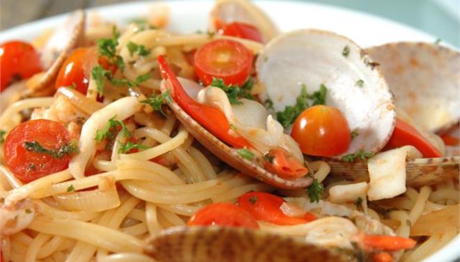 Τσιγαρίζουμε το κρεμμύδι και μόλις πάρει λίγο χρώμα ρίχνουμε το σκόρδο. Ανακατεύουμε καλά γιατί δεν πρέπει να μαυρίσουν, σβήνουμε με κρασί, και ρίχνουμε τη ντομάτα, αλάτι, πιπέρι, και τα αρωματικά δεμένα σε ένα πουγκάκι από τούλι. Αν η ντομάτα είναι ξινή (τον χειμώνα) προσθέτουμε λίγη ζάχαρη και ντοματοπελτέ. Οταν η σάλτσα βράσει και δέσει προσθέτουμε πρώτα τα οστρακοειδή καλά πλυμένα. Μόλις αρχίσουν να ανοίγουν ρίχνουμε και τις γαρίδες και αφήνουμε να βράσουν για 2-3 λεπτά.