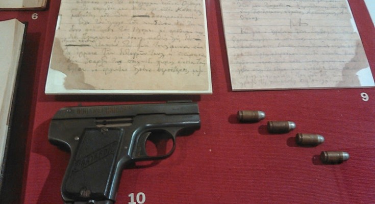 Φωτογράφισα και το περίστροφο με το οποίο αυτοκτόνησε ο Καρυωτάκης. Βρίσκεται στο Μουσείο Μπενάκη, στο κτήριο της Κριεζώτου. Το είχε αγοράσει την ίδια μέρα που το χρησιμοποίησε. Αυτό το επιβεβαιώνει ο γιος του οπλοπώλη, ο κύριος Γιάννης Αναγνωστόπουλος σε ένα αφιέρωμα του Φρέντυ Γερμανού στην ΕΡΤ. Εκεί είπε ακόμη ότι το περίστροφο ήταν μάρκας Μπράουν, από αυτά δηλαδή που γεμίζουν από την κάτω πλευρά, κατά τα λεγόμενά του. Διαβάζω ωστόσο στο ανάγλυφο του όπλου να γράφει Bayard, που παραπέμπει σε ένα τύπο Βελγικών περιστρόφων που φαίνεται να είχε κατασκευαστεί στα 1908. Ίσως το Μπράουν να είναι μια γενικότερη κατηγορία στα οποία υπάγεται το Bayard.