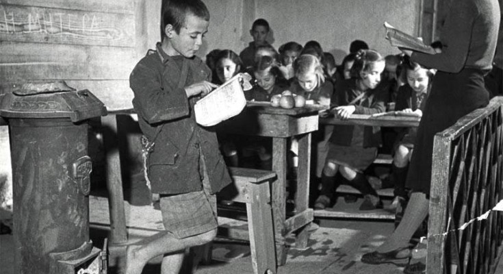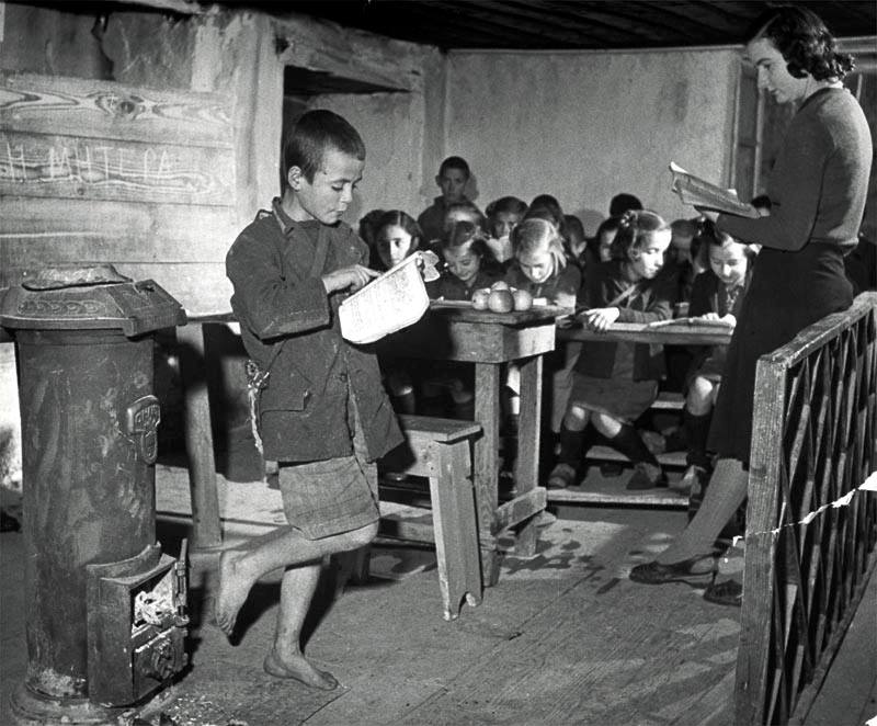 Τα παιδιά των πιο φτωχών οικογενειών θα έτρωγαν στο σχολείο από τη βοήθεια της UNNRA , της Οργάνωσης Βοήθειας και Αποκατάστασης των Ηνωμένων Εθνών.