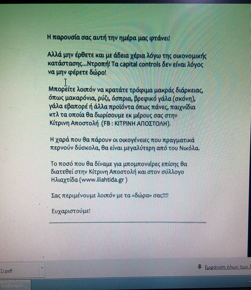 Στην πρόσκληση αναφέρουν όρι είναι αρκετή η παρουσία των καλεσμένων και τα … capital controls δεν είναι λόγος για να εμποδίσει τους καλεσμένους απο το προσφέρουν … δώρα καρδιάς και αλληλεγγύης !