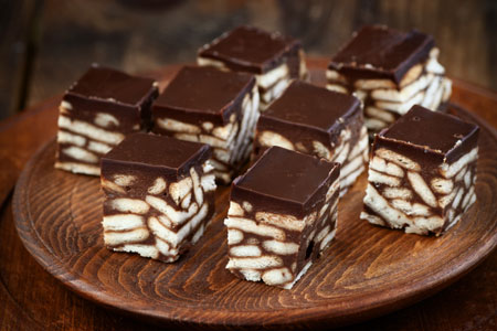 - Από πάνω απλώνουμε το σοκολατένιο μείγμα που κρατήσαμε στην άκρη. Αφήνουμε στο ψυγείο να σταθεροποιηθεί η σοκολάτα (περίπου 2 ώρες) και ξεφορμάρουμε. Το κόβουμε σε τετράγωνες μπουκίτσες «κυβάκια» και το ….απολαμβάνουμε.