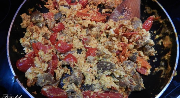 Τσιγαρίζω τις πιπεριές και τα σύγκλινα (κομματάκια) μέχρι να ψιλοροδίσουν, ρίχνω τα ντοματάκια, και περιμένω λίγο (2-3 λεπτά).