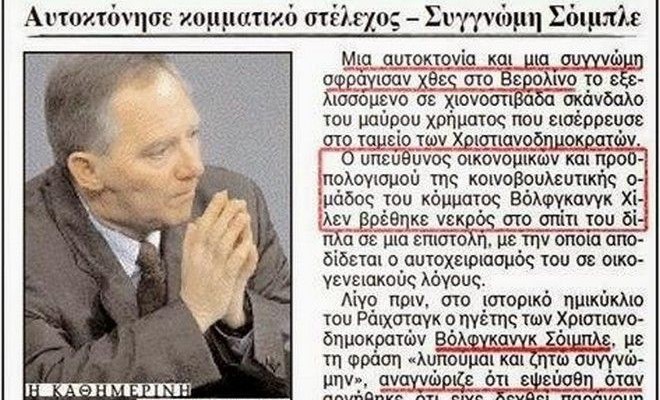 “Χάος, δράμα, συμφορά” ήταν ο τίτλος της έγκυρης εβδομαδιαίας εφημερίδας του Αμβούργου “Die Zeit”. “Οι υποκρισίες του Σόιμπλε προκαλούν συμπόνια”. Ο πολιτικός, που είχε υποσχεθεί την πλήρη διαλεύκανση του “σκανδάλου Κολ”, ήτοι της παράνομης συλλογής χρημάτων και του λαδώματος κομματικών στελεχών από τον προκάτοχό του στην προεδρία του κόμματος κ. Χέλμουτ Κολ, συνελήφθη κλέπτων και ο ίδιος. Και όχι μόνο αυτό. “Την ίδια “διαφώτιση” μας υπόσχεται και τώρα, παρά το γεγονός ότι παραπλάνησε τη Βουλή και αγγίζει με βελούδινα γάντια τον πρωταγωνιστή των παρανομιών, τον Κολ”.