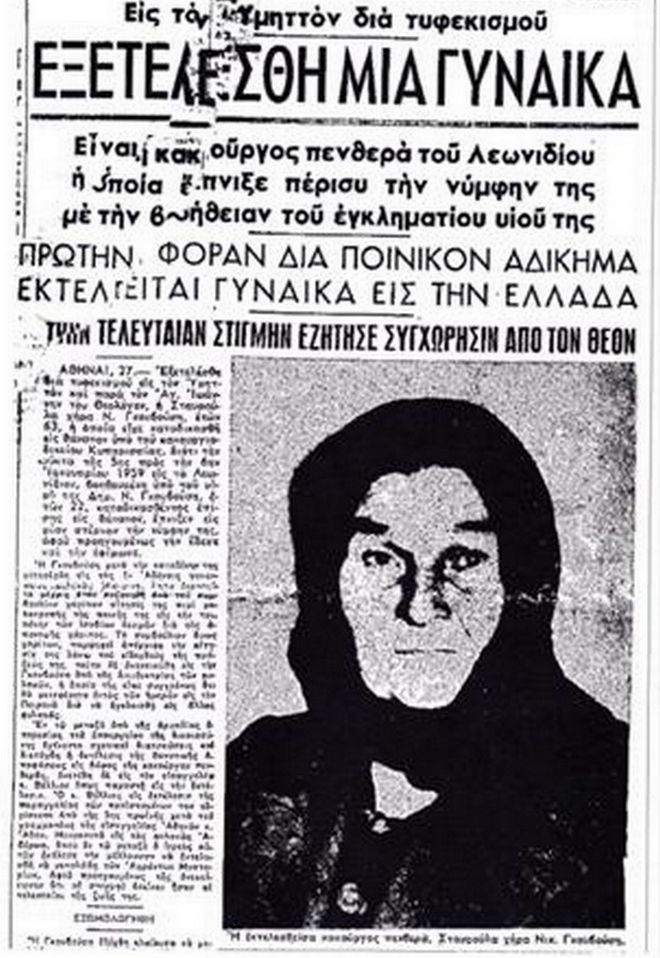 Η Αθανασία Αγγελινού, μία από τις τέσσερις γυναίκες που καταδικάστηκαν σε θάνατο και εκτελέστηκαν, είχε ομολογήσει πως δολοφόνησε το σύζυγό της, Νίκο, με κασμά ενώ εκείνος κοιμόταν.