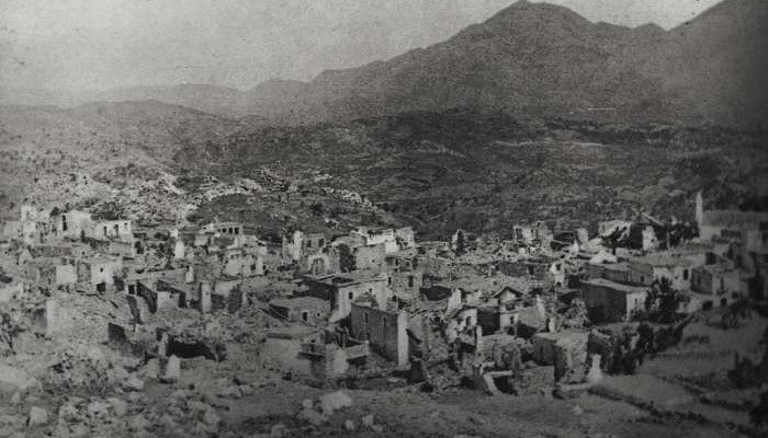 Όταν δέκα μέρες μετά την αποχώρησή τους ο ρασοφόρος καλόγερος με οδήγησε με ήρεμη υπερηφάνεια ανάμεσα στα χαλάσματα ούτε ένα σπίτι δεν ήταν όρθιο. Οι Γερμανοί είχαν αφήσει τις τρεις εκκλησίες, αλλά ο δρόμος μας ήταν μπλοκαρισμένος σε κάθε βήμα μας από σωρούς από πέτρες και σπασμένα κεραμίδια ή κομμάτια από πιθάρια στα οποία αποθηκεύονταν το λάδι και το κρασί του χωριού. Στο δυσδιάκριτο πέρασμα των δρόμων του χωριού προχωρήσαμε πρώτα στην εκκλησία του ρασοφόρου Καλόγερου, τη μεγαλύτερη από τις τρεις. Ήταν απίστευτο να βρούμε ακόμα να κρέμονται στη θέση τους τις πλούσιες με ασήμι και επίχρυσες εικόνες τριγυρισμένες από μαραμένα λουλούδια. Έξω βρίσκεται σε κατάσταση σήψης με μυρωδιά που προκαλεί ναυτία ένα χοιρινό σφάγιο που κάηκε στον κοντινό στάβλο.