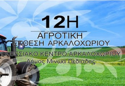 Ο Δήμος Μινώα Πεδιάδας, σας προσκαλεί την Τετάρτη 2 Σεπτεμβρίου και ώρα 19.30 μ.μ. στα εγκαίνια της 12ης Παγκρήτιας Αγροτικής Έκθεσης Αρκαλοχωρίου η οποία θα διεξαχθεί από τις 2 έως τις 7 Σεπτεμβρίου στο Εκθεσιακό Κέντρο Αρκαλοχωρίου.