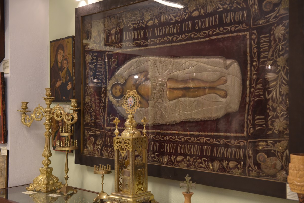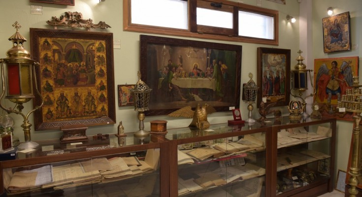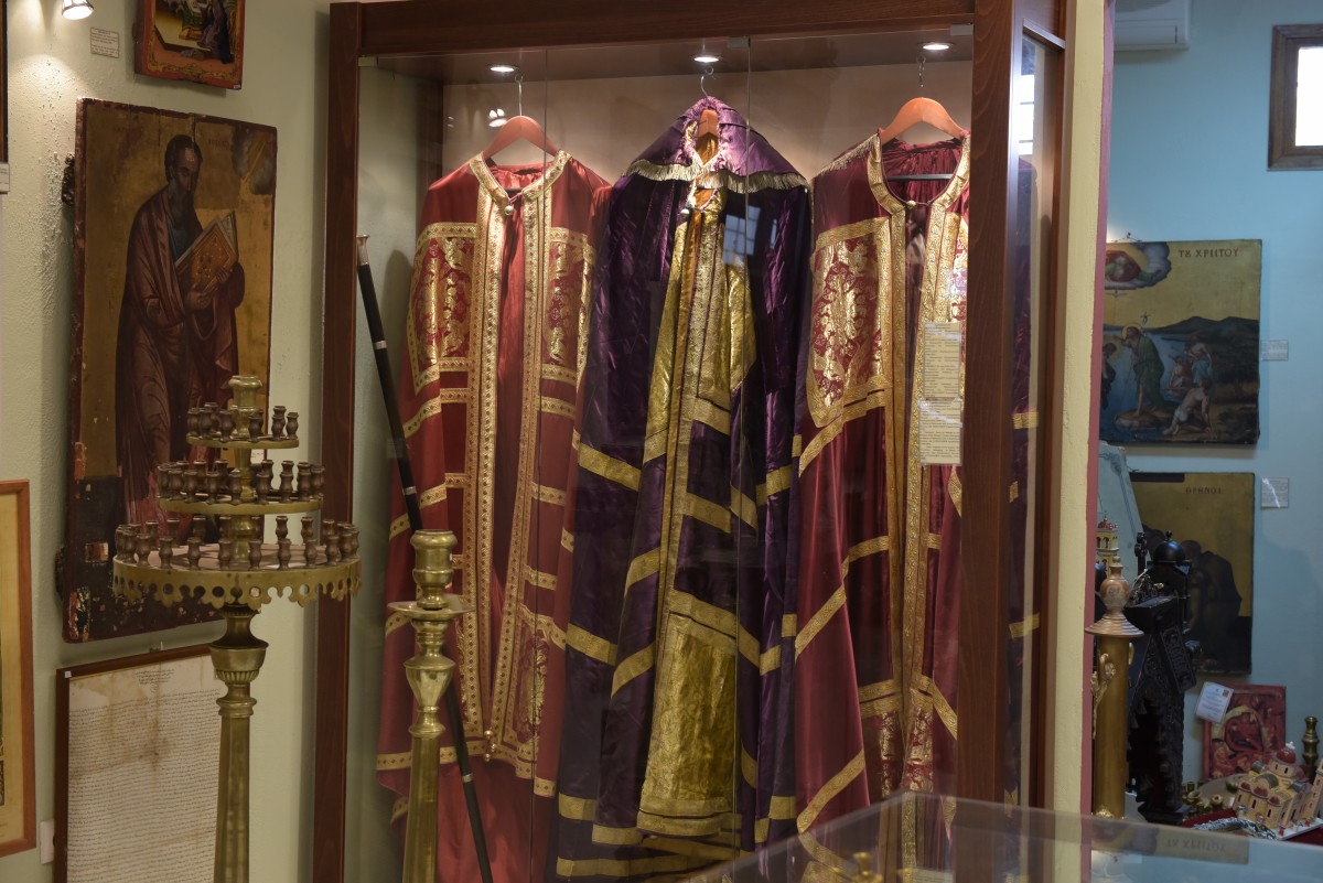 Τα ιερά αυτά κειμήλια που βρίσκονται στο Μουσείο αποτελούν δημιουργήματα πίστης του λαού μας, όπως εικόνες, ιερά σκεύη, βιβλία.