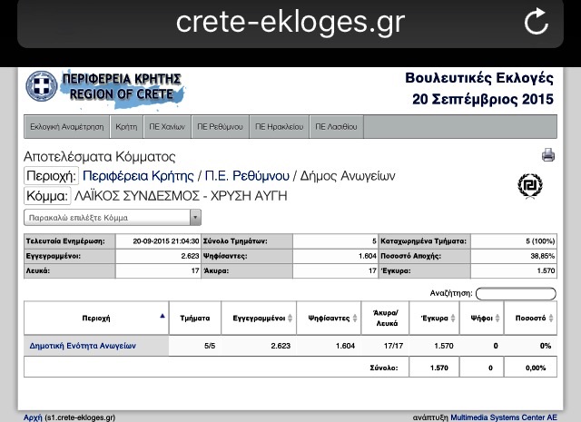Μηδέν και πάλι οι ψήφοι στην Χρυσή Αυγή σε ένα τόπο που δεν λησμονά, σε ένα τόπο που κάθε σπίτι του που χτίστηκε με θυσίες μετά το τελευταίο Ολοκαύτωμα από τους Ναζί φασίστες τον Αύγουστο του 1944. Τα Ανώγεια δείχνουν ξεκάθαρα τον δρόμο της Δημοκρατίας και θλίβονται για το γεγονός ότι στην υπόλοιπη χώρα το μόρφωμα αυτό καταλαμβάνει την τρίτη θέση.