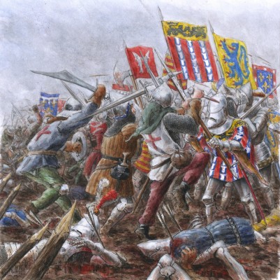 Οι κοροϊδίες των Άγγλων λειτούργησαν και οι Γάλλοι Ιππότες επιτέθηκαν κατά μέτωπο, παρακούοντας τις εντολές του Μπουσικό. Αμέσως οι Άγγλοι άρχισαν να εκτοξεύουν τα βέλη τους, που έσπειραν τον πανικό στους επιτιθέμενους. Τα άλογα αφήνιασαν και έριξαν τους αναβάτες και οι ιππότες με τη βαριά πανοπλία δεν μπορούσαν να σηκωθούν, αν γλιστρούσαν στο λασπώδες έδαφος,