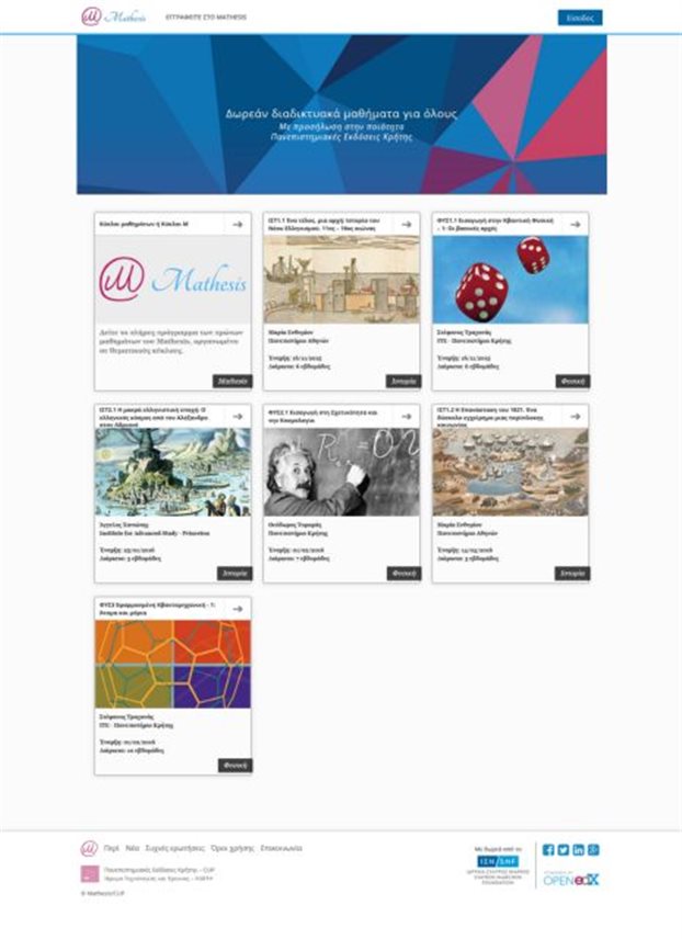 Η ελληνική εκδοχή των περίφημων MOOCs (Massive Open Online Courses), της νέας «καθαρής» μορφής διαδικτυακής γνώσης, κατοικεί στην Κρήτη. Με «αρχιτέκτονα» τον καθηγητή Φυσικής του Πανεπιστημίου Κρήτης και διευθυντή των Πανεπιστημιακών Εκδόσεων Κρήτης κ. Στέφανο Τραχανά, το «Mathesis» ξεκινά τον Νοέμβριο και ήδη αριθμεί μερικές χιλιάδες εγγεγραμμένων φοιτητών.