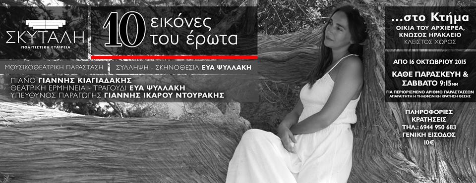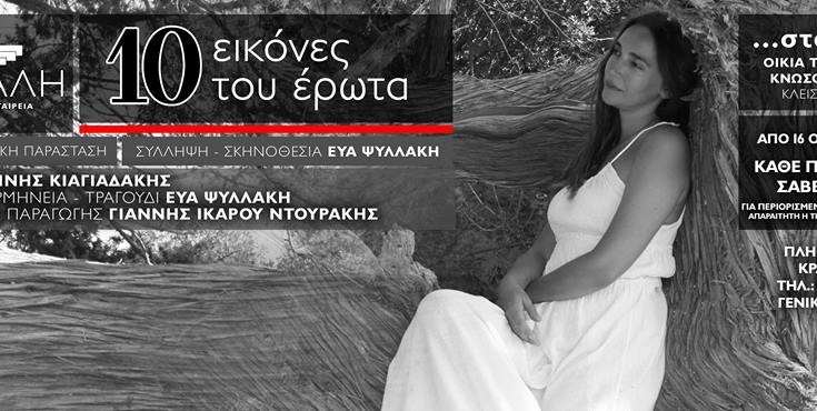 Η Ηρακλειώτισα ηθοποιός Εύα Ψυλλάκη, έπειτα από μια επιτυχημένη πορεία χρόνων στα θεατρικά και μουσικά δρώμενα της πρωτεύουσας, επαναπατρίζεται καλλιτεχνικά στην γενέτειρά της το Ηράκλειο, για πρώτη φορά σε πιο σταθερή βάση, παρουσιάζοντας την ιδιαίτερη μουσικοθεατρική παράσταση “10 εικόνες του έρωτα’’ . Συνοδοιπόρος σ’ αυτό το ταξίδι είναι ο Γιάννης Κιαγιαδάκης στο πιάνο.