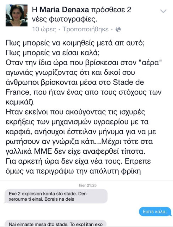 «Πώς μπορείς να κοιμηθείς μετά απ’ αυτό; Πώς μπορείς να είσαι καλά; Όταν την ίδια ώρα που βρίσκεσαι στον αέρα αγωνιάς γνωρίζοντας ότι και δικοί σου άνθρωποι βρίσκονται στο Stade de France, που ήταν ένας από τους στόχους των καμικάζι. Ήταν εκείνοι που ακούγοντας τις ισχυρές εκρήξεις των μηχανισμών υγραερίου με τα καρφιά, ανήσυχοι έστειλαν μήνυμα για να με ρωτήσουν αν γνώριζα κάτι… Μέχρι τότε στα γαλλικά ΜΜΕ δεν είχε αναφερθεί τίποτα. Για αρκετή ώρα δεν είχα νέα τους. Έπρεπε όμως να περιγράψω την απόλυτη φρίκη» έγραψε η Μαρία Δεναξά στο facebook. Δείτε παρακάτω το post της.