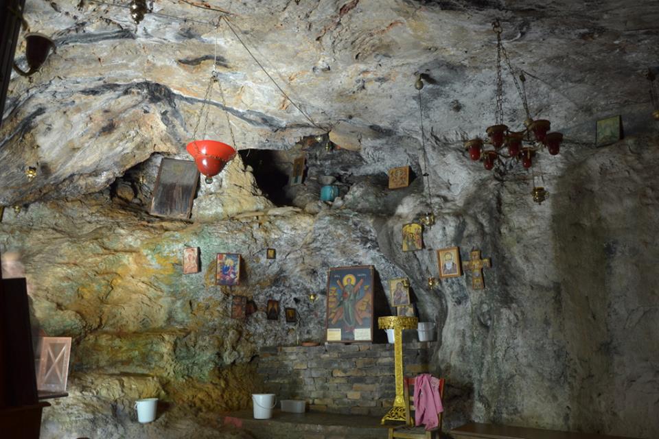 Ο ναός είναι κτισμένος μέσα στον βράχο ενώ δίπλα του υπάρχουν αρκετά πεύκα.