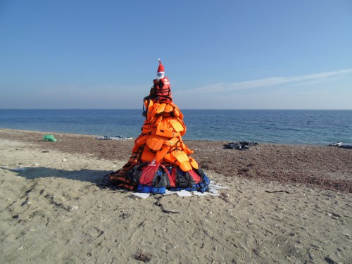 Διασώστες έστησαν ένα Χριστουγεννιάτικο δέντρο από πορτοκαλί σωσίβια προσφύγων, το σήμα κατατεθέν της σύγχρονης προσφυγιάς, που φορούν οι εκατοντάδες χιλιάδες άνθρωποι που φτάνουν στις ακτές της Λέσβου με τις πλαστικές βάρκες. Το δέντρο στήθηκε στην ακτή της Νεάπολης, νότια της πόλης της Μυτιλήνης.