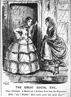 Σκίτσο από περιοδικό του 1857 όπου ως gay αναφέρονται οι πόρνες. Η μία γυναίκα ρωτάει την άλλη «από πότε είσαι gay», δηλαδή πόρνη;
