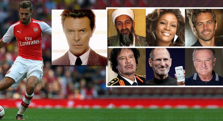 Έτσι, μετά τους (πάρτε ανάσα) Οσάμα Μπιν Λάντεν, Γουίτνεϊ Χιούστον, Πολ Γουόκερ, Μουαμάρ Καντάφι, Στιβ Τζομπς, Ρόμπιν Γουίλιαμς και σερ Ρίτσαρντ Ατένμπορο, τη μοίρα των διασημοτήτων που φεύγουν από τη ζωή, όποτε σκοράρει ο Ράμσεϊ, ακολούθησε σήμερα, Δευτέρα, και ο Ντέιβιντ Μπάουι, που έχασε τη μάχη με τον καρκίνο σε ηλικία 69 ετών.