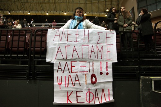 Στη συγκέντρωση στο κλειστό γήπεδο του Ταέ Κβο Ντο, για τον ένα χρόνο από την εκλογική νίκη του ΣΥΡΙΖΑ ο φωτογραφικός φακός απαθανάτισε στιγμιότυπο με γυναίκα που κρατούσε πανό με το σύνθημα «Αλέξη, σε αγαπάμε – Αλέξη, ψηλά το κεφάλι».