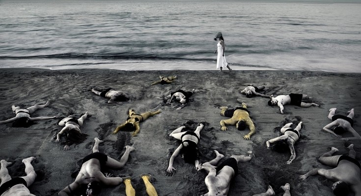 Νέοι άνθρωποι ξαπλωμένοι, σα νεκροί, στην παραλία. Το τοπίο μουντό και ασπρόμαυρο. Στην ακτή, μια κοπέλα με αντιασφυξιογόνα μάσκα «αποκωδικοποιεί» το μήνυμα της φωτογραφίας.