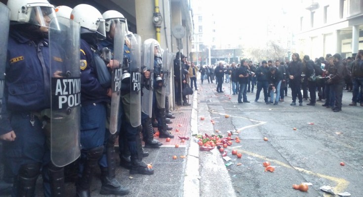 Δακρυγόνα έπεσαν λίγο μετά τις 10 το πρωί έξω από το Υπουργείο Αγροτικής Ανάπτυξης, σε εκτεταμένα επεισόδια μεταξύ των αγροτών και των ΜΑΤ, ενώ είχαν παρεισφρήσει και κουκουλοφόροι, στην Πλατεία Βάθης. Οι αγρότες πέταξαν ντομάτες και άλλα αγροτικά προϊόντα και στη συνέχεια οι αστυνομικοί απάντησαν με χημικά. Προκλήθηκαν ζημιές