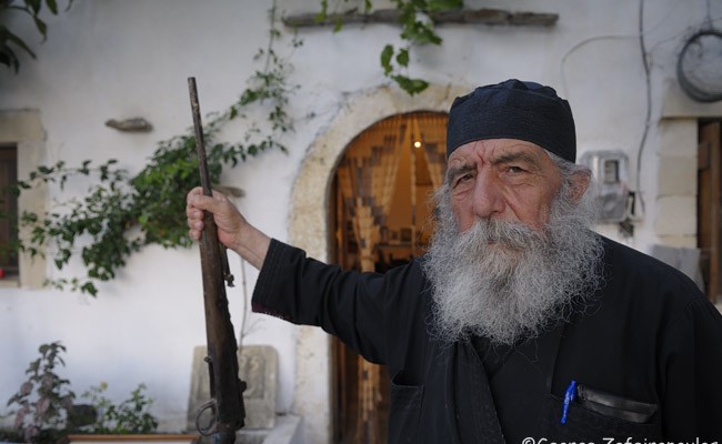 Μόλις τέλειωσε τη φράση του ο παπα-Γιώργης έφυγε για λίγο και γύρισε κρατώντας ένα παλιό εγγλέζικο και παροπλισμένο τουφέκι με κομμένη την κάνη. Το κρατούσε καμαρωτά, ως ένδειξη παλικαριάς και άρνησης συμβιβασμού με κάθε μορφής κατεστημένο. Μερικοί Σφακιανοί τον παρομοιάζουν με τον Παπαφλέσσα, αλλά αυτός αρνείται κατηγορηματικά ότι μπορεί να μοιάσει έστω και στο μικρό δαχτυλάκι αυτού του μεγάλου επαναστάτη.