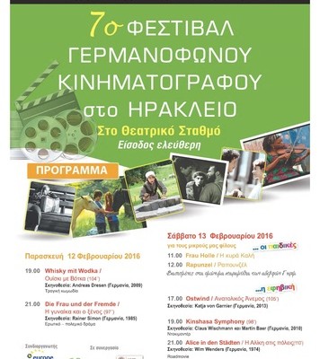 Η Τοπική Επιτροπή Ηρακλείου της Πανελλήνιας Ένωσης Καθηγητών Γλώσσας Π.Ε. σε συνεργασία με το Europe Direct της Περιφέρειας Κρήτης και το Ινστιτούτο Goethe Αθηνών υπό την αιγίδα του Δήμου Ηρακλείου και την Αντιδημαρχία Παιδείας, Δια Βίου Μάθησης, Νέας Γενιάς και Καινοτομίας, διοργανώνουν για 7η συνεχόμενη χρονιά το Φεστιβάλ Γερμανόφωνου Κινηματογράφου στο Θεατρικό Σταθμό Ηρακλείου.