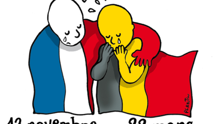 Στο σκίτσο ένα ανθρωπάκι τυλιγμένο με τις σημαία της Γαλλίας, παρηγορεί αγκαλιάζοντας το ανθρωπάκι που είναι τυλιγμένο με την σημαία του Βελγίου.