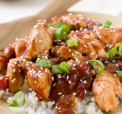 Σερβίρετε το γλυκόξινο κοτόπουλο επάνω σε βρασμένο ρύζι μπασμάτι και πασπαλίζετε με τα ψιλοκομμένα κρεμμυδάκια και το σουσάμι.