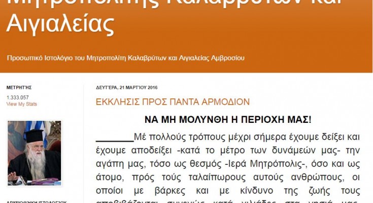 Ο Μητροπολίτης Καλαβρύτων με ένα μήνυμά του στο προσωπικό του blog, αναφέρει ότι αποδέχεται τους πρόσφυγες μόνο ως περαστικούς από τον τόπο μας και εξηγεί γιατί «δεν αντέχουμε να τους κρατήσουμε κοντά μας. «Δεν ταιριάζουν τα χνώτα μας. Δεν ταιριάζουν τα ήθη και τά έθιμά μας Δεν μας αρέσει ο πολιτισμός τους. Δεν αποδεχόμεθα την θρησκεία τους! Δεν θέλουμε να υποκύψουμε στα πονηρά κόλπα και τα σατανικά σχέδια των Μεγάλων του κόσμου τούτου, οι οποίοι θέλουν την διάλυση της Ελλάδος μας».