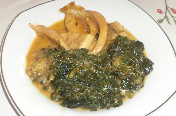 Καθαρίζουμε τις σουπιές καλά,αδειάζουμε το εσωτερικό και ξεπλένουμε καλά το μελάνι. Βάζουμε στην κατσαρόλα 1 μεγάλο φλυτζάνι ελαιόλαδο , κόβουμε τις σουπιές σε κομμάτια και τις σοτάρουμε στο λάδι . Ρίχνουμε το κρεμμυδάκι , τον άνιθο , αλάτι-πιπέρι , τις ντομάτες και 2 ποτήρια νερό και τα αφήνουμε να βράσουν για 45 λεπτά. Πλένουμε καλά το σπανάκι , το κόβουμε σε μεγάλα κομμάτια και μόλις δούμε ότι οι σουπιές έχουν βράσει καλά και έχουν πιεί το ζουμί τους προσθέτουμε το σπανάκι και το αφήνουμε να ψηθεί για περίπου 15 λεπτά.