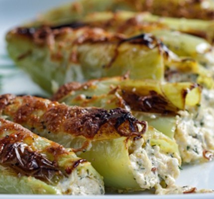 Προθερμαίνετε το φούρνο στους 180 βαθμούς. Σε μια κατσαρόλα με άφθονο αλατισμένο νερό που βράζει ζεματάτε τις πιπεριές για 10 λεπτά. Τις βγάζετε και τις ακουμπάτε σε απορροφητικό χαρτί να στεγνώσουν.