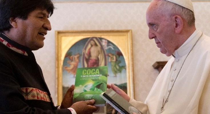 Ο Πρόεδρος της Βολιβίας εδώ και καιρό είναι επικεφαλής της συνδικαλιστικής ένωσης των «cocaleros», των καλλιεργητών των φύλλων κόκας και υποστηρίζει την αποποινικοποίηση σε διεθνές επίπεδο της κατανάλωσης φύλλων κόκας. Το δώρο του στον Πάπα Φραγκίσκο είναι τρία βιβλία σχετικά με τα οφέλη αυτού του φυτού, του οποίου η Κολομβία είναι η πρώτη παραγωγός χώρα παγκοσμίως.