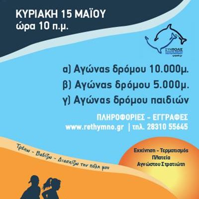 O Δήμος Ρεθύμνου και το Τμήμα Αθλητισμού με την υποστήριξη του ΣΥΝ ΠΟΛΙΣ και υπό την αιγίδα της Γενικής Γραμματείας Αθλητισμού έχοντας ως στόχο την παροχή επιπλέον ευκαιριών και κινήτρων αθλητικής δραστηριότητας στους κατοίκους του Δήμου και όχι μόνο, προκηρύσσει τρεις (3) παράλληλους αγώνες δρόμου για αθλητές, μη αθλητές και για παιδιά.