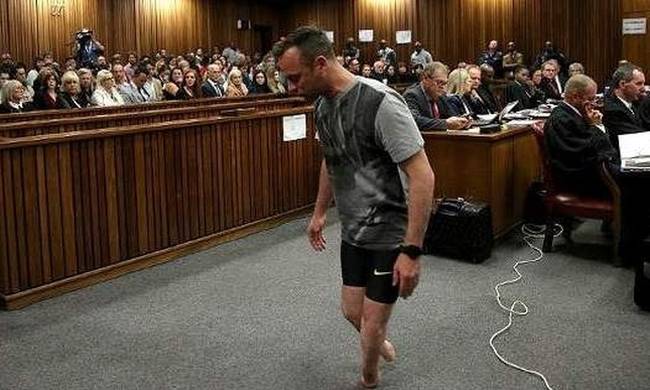 Ο Πιστόριους, που έχει υποστηρίξει ότι εκείνο το βράδυ πίστεψε ότι στο σπίτι του είχε μπει ληστής, σηκώθηκε, έβγαλε τα προσθετικά του άκρα και τρεκλίζοντας, ιδρώνοντας και με δάκρυα στα μάτια έκανε μερικούς γύρους από τα βλέματα όλων των παρευρισκομένων στην ασφυκτικά γεμάτη αίθουσα του δικαστηρίου.