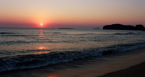 Η ρόζ αμμουδιά σε συνδιασμό με το ηλιοβασίλεμα του Μπάλου, συνθέτουν έναν επιβλητικό πίνακα ζωγραφικής