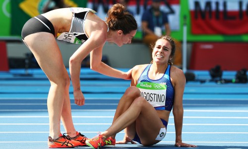 1049357_3500_6Κατά την κούρσα των προκριματικών των 5000μ. η νεοζηλανδή Nikki Hamblin και η αμερικανίδα Abbey D’Agostino συγκρούστηκαν. Η Hamblin έχασε την ισορροπία της, σκόνταψε και έπεσε, αλλά συμπαρέσυρε και την D’Agostino η οποία έτρεχε ακριβώς πίσω της. Η Hamblin παρέμενε πεσμένη στη διαδρομή ενώ η D’Agostino σηκώθηκε γρήγορα και την τράβηξε να σηκωθεί για να συνεχίσουν.
