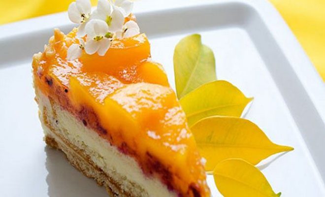 Όλο αυτό το μείγμα το βάζετε σε βουτυρωμένο και πασπαλισμένο με σιμιγδάλι πυρέξ. Σε όλη την επιφάνεια του πυρέξ τοποθετείτε τα κομμένα ροδάκινα.
