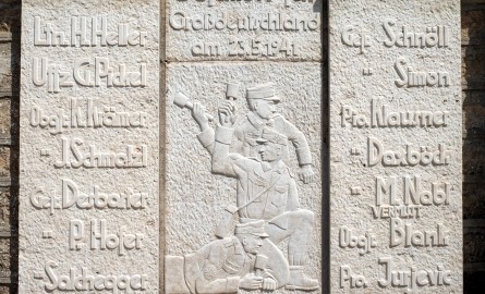 Αυτή η πλάκα υπήρχε μέχρι ένα χρονικό διάστημα και καταστράφηκε. Και φτιάξανε στη Γερμανία μία αντιγραφή της πλάκας, ιδιωτική πρωτοβουλία μίας ομάδος της συγκεκριμένης Μεραρχίας. Και αντί για αγκυλωτό σταυρό έχουν ένα σταυρό πιο ουδέτερο, δεν έχει την ίδια γεύση.Αλλά κατά τα άλλα είναι ακριβές αντίγραφο. Δείχνει τρεις στρατιώτες με χειροβομβίδες στον αγώνα. Κάτι συμβολίζει αυτό.