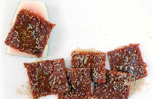 Προθερµαίνουµε τον φούρνο στους 180°C, στον αέρα. Βουτυρώνουµε και αλευρώνουµε ένα ταψί, πασπαλίζουµε µε λίγο σουσάµι και ρίχνουµε µέσα το µείγµα, το πάχος του οποίου πρέπει να είναι 2-3 εκ. Ψήνουμε για περίπου 80 λεπτά. Αφού ψηθεί η καρπουζένια, την αλείφουµε µε το µέλι, µε τη βοήθεια ενός πινέλου, και πασπαλίζουµε µε λίγο ακόµη σουσάµι. Αφήνουµε να κρυώσει λίγο και σερβίρουµε.