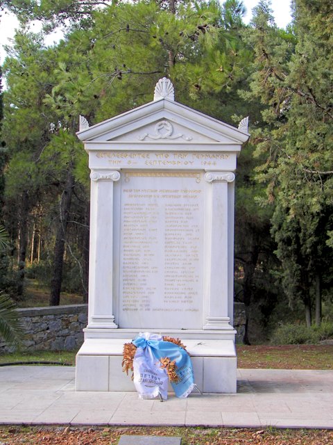 Μνημείο στο σημείο της εκτέλεσης, στον Διομήδειο Κήπο. Αναγράφονται 49 πεσόντες, ενώ 13 αναφέρονται ως μη αναγνωρισθέντες. Η έρευνα του Κ. Σβολόπουλου κατέληξε ότι οι εκτελεσθέντες είναι 59. Συγκεκριμένα λείπουν τα ονόματα των : Παναγιώτη Αγγελόπουλου, Ανδρέα Διαμαντόπουλου, Γεώργιου Ευσταθίου, Γεώργιου Καλογερόπουλου, Ερρίκου Λεβεντάκου, Γεώργιου Μαστοράκη, Γρηγόριου Μουρμούρη, Γεώργιου Ριζόπουλου, Ανδρέα Σκαρπέτα, Νικολάου Σπαθή. Η τοπική κοινωνία δεν έχει αποδώσει την πρέπουσα τιμή στους εκτελεσμένους ήρωες.