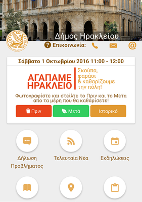 Στην εφαρμογή για κινητές συσκευές (Android & iOS) «Δημότης Ηρακλείου» που έχει δημιουργήσει ο Δήμος Ηρακλείου και μέσω της οποίας μπορούν οι πολίτες να δηλώνουν κάθε πρόβλημα, να ενημερώνονται για τα νέα, τις εκδηλώσεις και τις διακηρύξεις του Δήμου, βρίσκεται πλέον και η δράση του Σαββάτου 1ης Οκτωβρίου 2016 «ΑΓΑΠΑΜΕ ΗΡΑΚΛΕΙΟ».