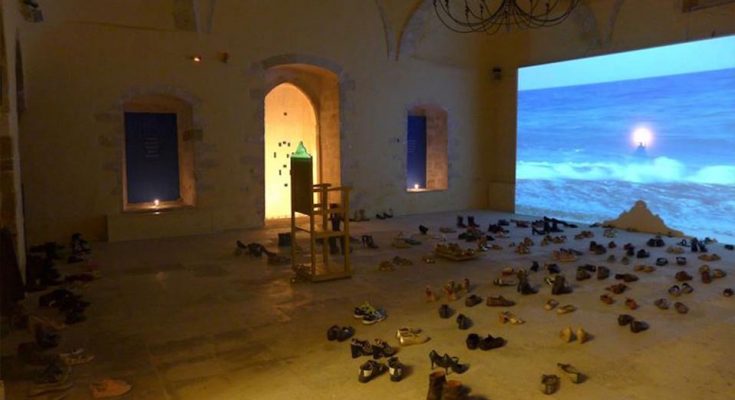 Εκατοντάδες ζευγάρια παπούτσια, που δώρισαν κάτοικοι των Χανίων ύστερα από ανοιχτό κάλεσμα της Πινακοθήκης της πόλης, οδηγούν στην είσοδο του ιστορικού και συγκινησιακά φορτισμένου μνημείου.