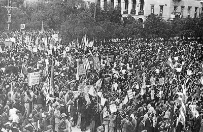 Ξεκίνησαν τρομακτικές διαδηλώσεις με τον κόσμο στους δρόμους να γιορτάζει την απελευθέρωση. Υψώθηκαν γαλανόλευκες, αλλά και σημαίες κόκκινες, με σφυροδρέπανα, όπως και αμερικάνικες και αγγλικές.