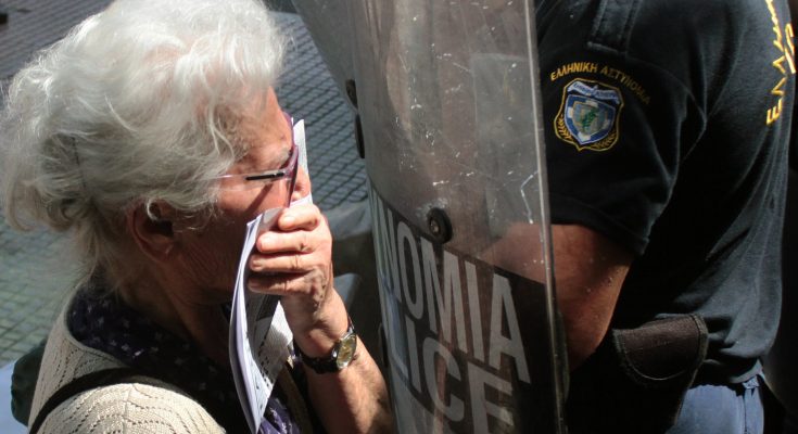 Μεταξύ των συνταξιούχων διαδηλωτών βρέθηκε χθες και η ηλικιωμένη κυρία Κατίνα Μανιτάρα, η φωτογραφία της οποίας με την εφημερίδα στο πρόσωπο για να προστατευθεί από τα χημικά κάνει τον γύρο του διαδικτύου.