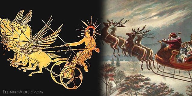 Το άρμα έγινε έλκηθρο, τα άλογα έγιναν τάρανδοι και το “δώρο” του φωτός που μοίραζε στους ανθρώπους …έγινε κυριολεκτικά “μοίρασμα δώρων”.