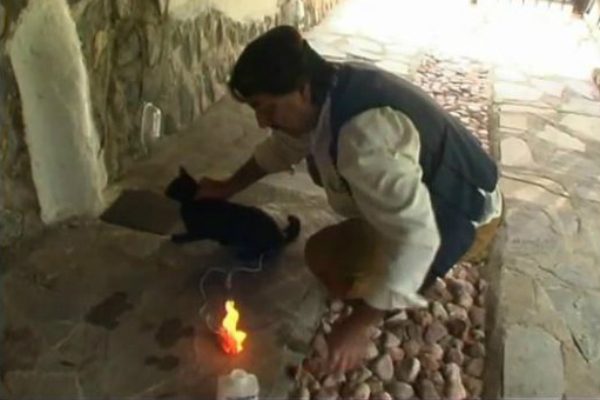 Η «πλάκα» όμως συνεχίζεται και ο ηθοποιός δένει στην ουρά του ζώου ένα σχοινί το οποίο καταλήγει σε στουπί, που έχει βρέξει με εύφλεκτη ουσία και στη συνέχεια του βάζει φωτιά. Η γάτα κατατρομαγμένη τρέχει και εξαφανίζεται από το πλάνο ενώ το στουπί στην ουρά του καίγεται…