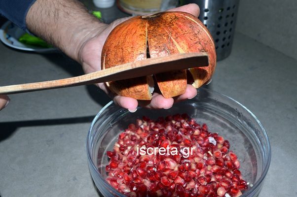 Στην αρχή χτυπάμε γύρω – γύρω το ρόδι, στη συνέχεια και στο κέντρο του, μέχρι να αδειάσουν όλα τα σποράκια.